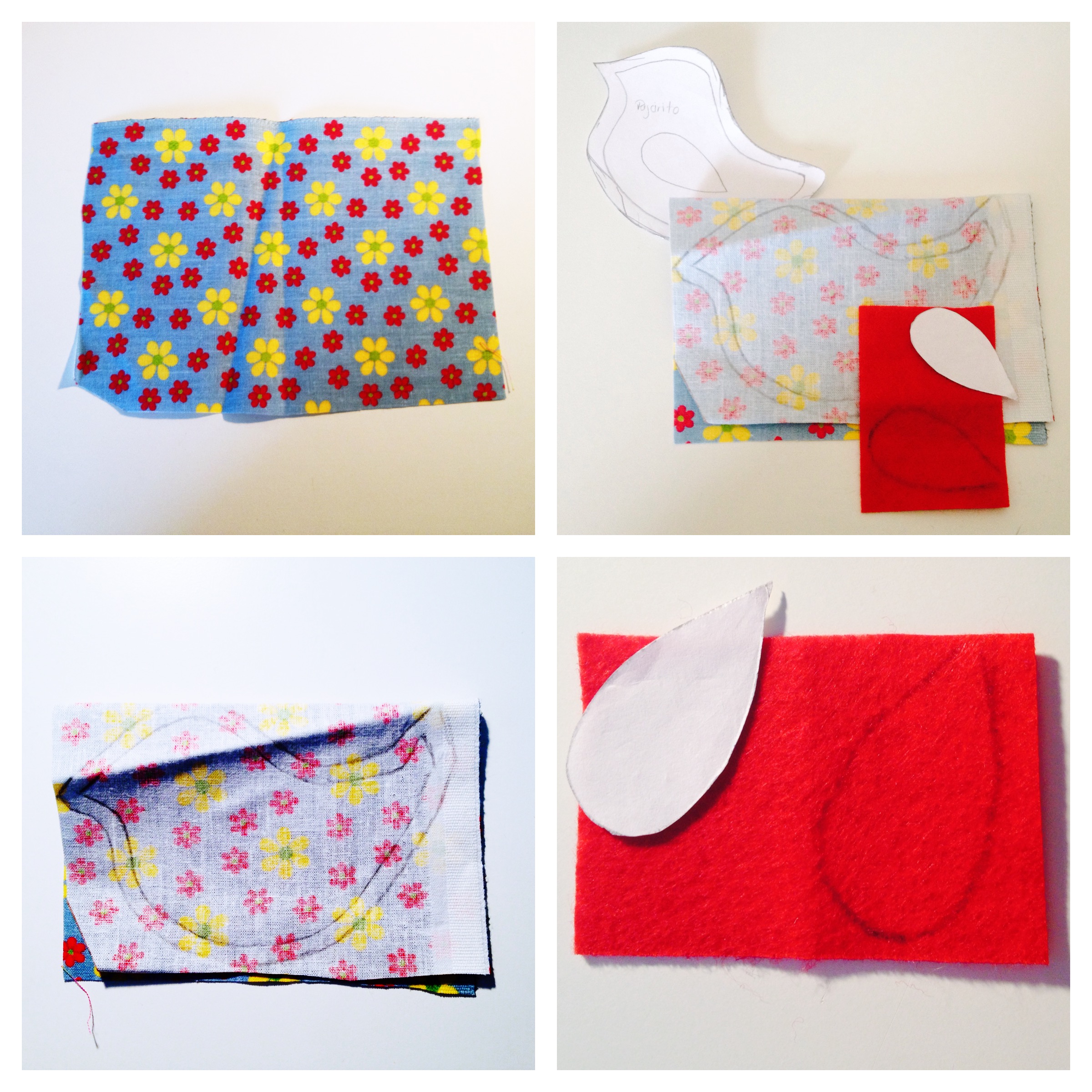 haces un patron como en este caso yo, y sus alitas. Luego a marcar con estos patrones las telas que esten dobladas para que agilizes este trabajo, luego las alitas en el fieltro a usar.