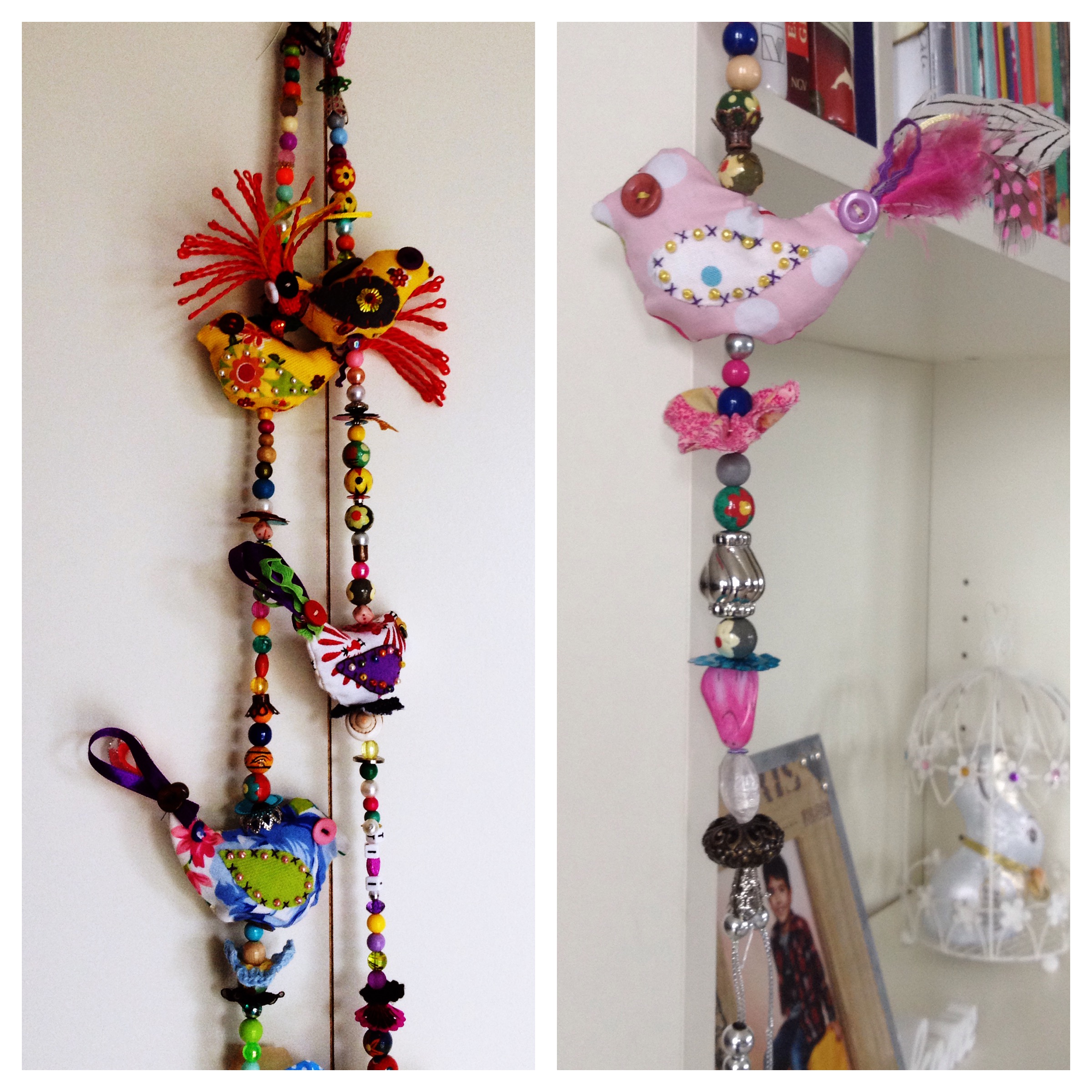 Como podras observar yo aquí realise un tipo collage colgante; con perlas de madera, tejidos, restos de lo que va uno acumulando por ahí, también puedes destrozar un collar que no uses y reutilizarlo, puedes utilizar estambre, cuerda normal… recycling és lo más importante! cuando termines el colgante, meterles cuidadosamente cada pajarito en la posicion que más te agrade y sellar esto con hilo para que no se muevan…